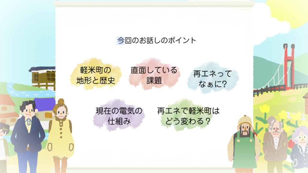 現在の電気の話しや再生可能エネルギーが町に普及していくとどんな効果が期待されるかなどを13分程度の動画で解説しています。
